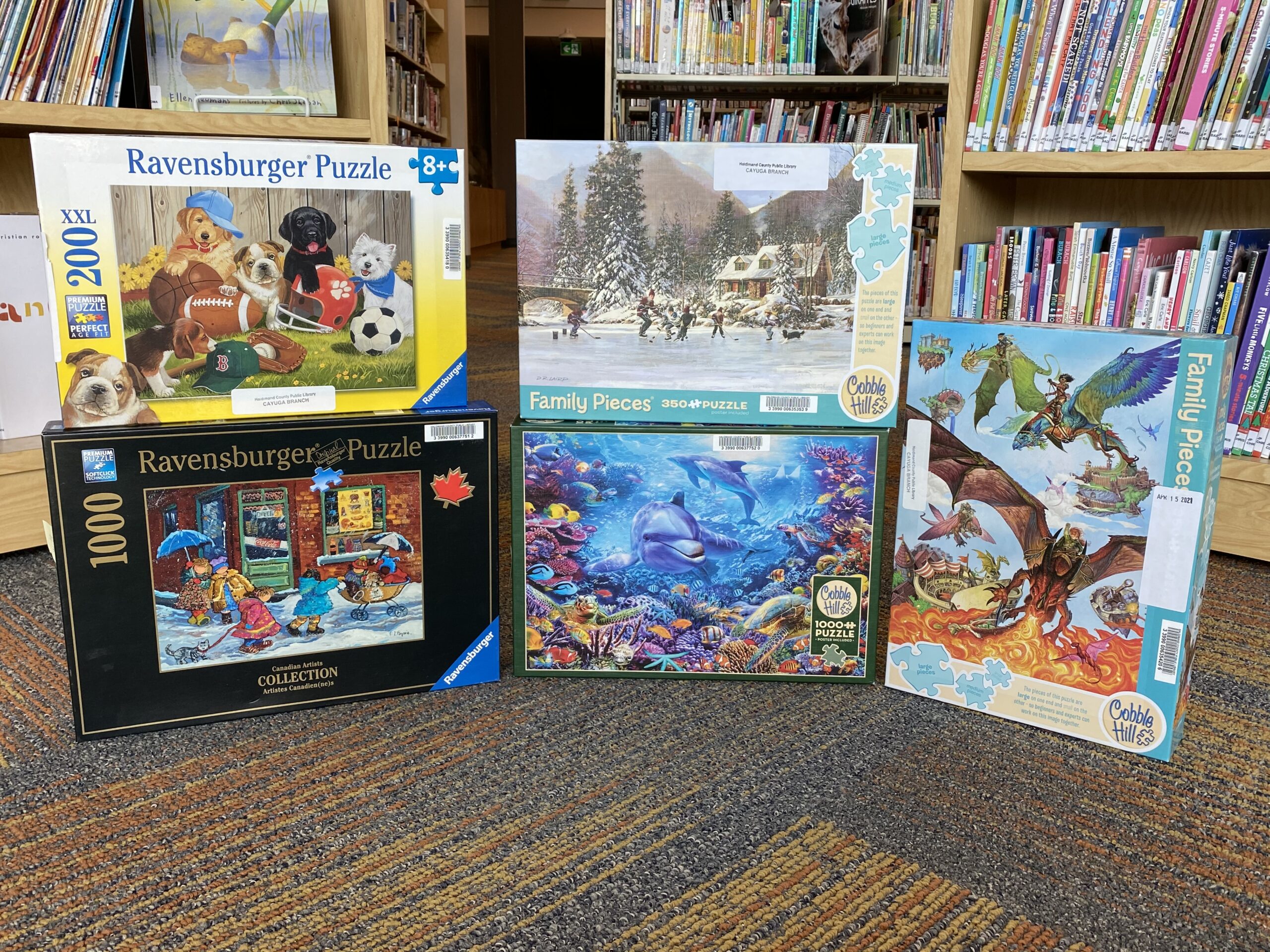 We are excited to offer over 400 jigsaw puzzles! With many different themes and brands like Ravensburger, Cobblehill and Charles Wysocki there is a puzzle for everyone! Choose from a variety of puzzles targeted for children and adults. Try a family-friendly family puzzle for the whole family! Click here to view all “jigsaw puzzles” in the library catalogue.